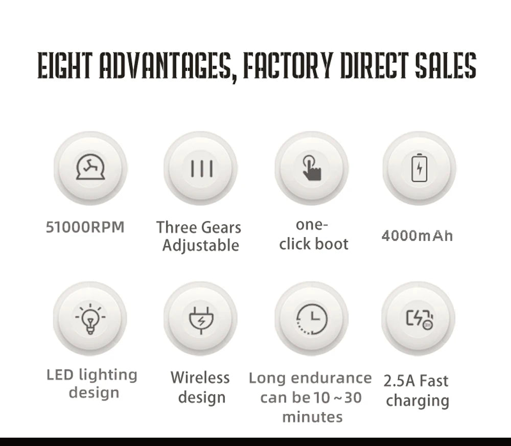 51000RPM / Three Gears Adjustable / one-click boot / 4000mAh / LED lighting design / Wireless design / Long endurance can be 10~30