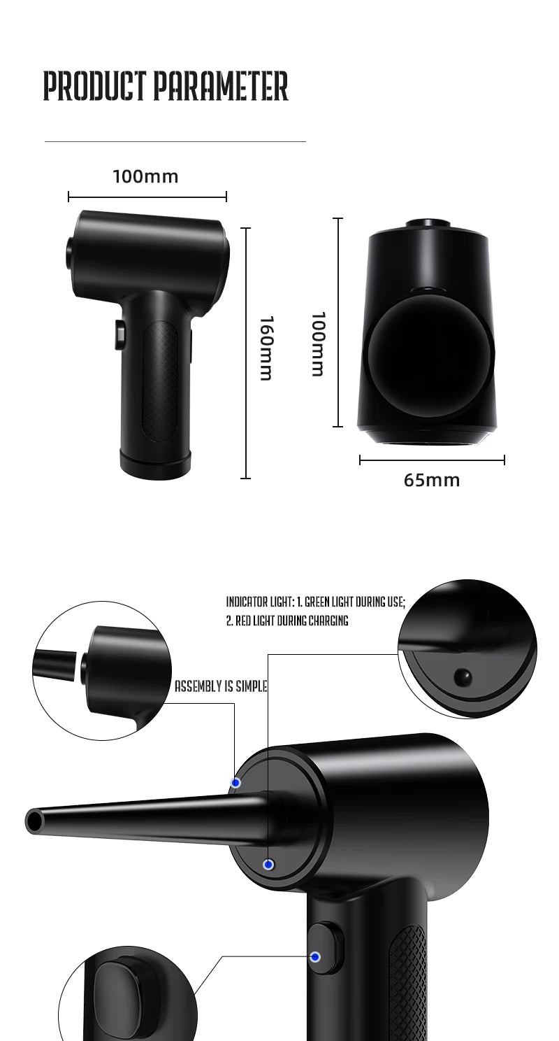 • Compressed Air Duster :This portable cordless air blower is a compressed air duster, perfect for removing dust and crumbs from your computer, keyboard, and car.