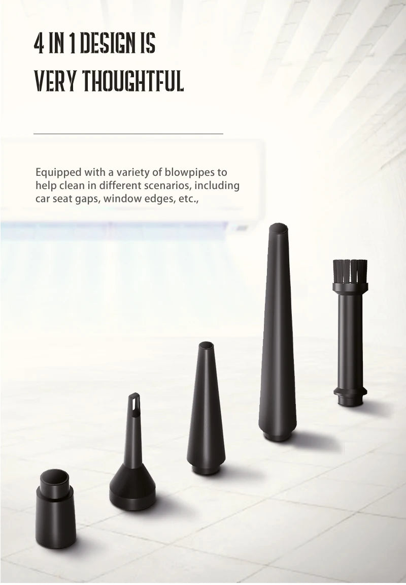 Equipped with a variety of blowpipes tohelp clean in different scenarios, includingcar seat gaps, window edges, etc.